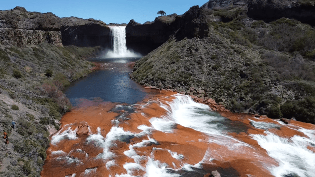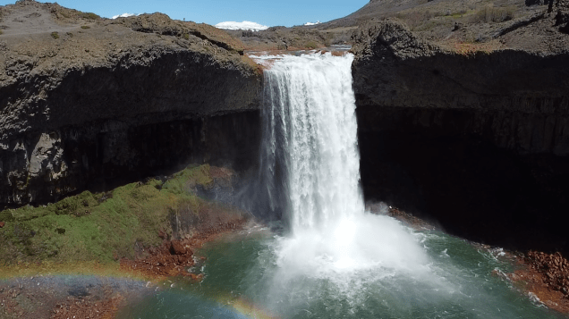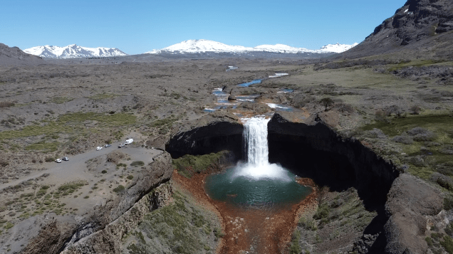 We started the day with perfect weather in Caviahue. Our first destination, the Salto del Agrio waterfall. It was an amazing sight and exceeded our expectations. The landscape was magical, it was hard to leave. Framed by snow-capped mountains and watched over by a lonely auracaria (pehuén) tree, the waterfall is majestic.