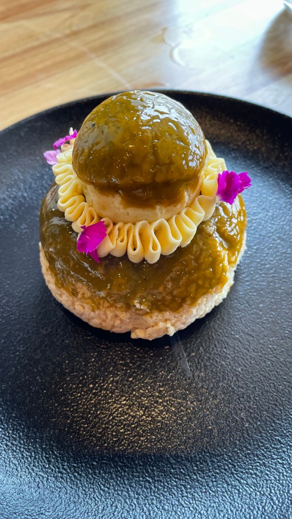 The lunch was great, starting with an amazing whole wheat bread topped with roasted onions, we enjoyed spinach pasta with morels and entraña and ended with scrumptious dessert of profiterole filled with cream and pavlova.