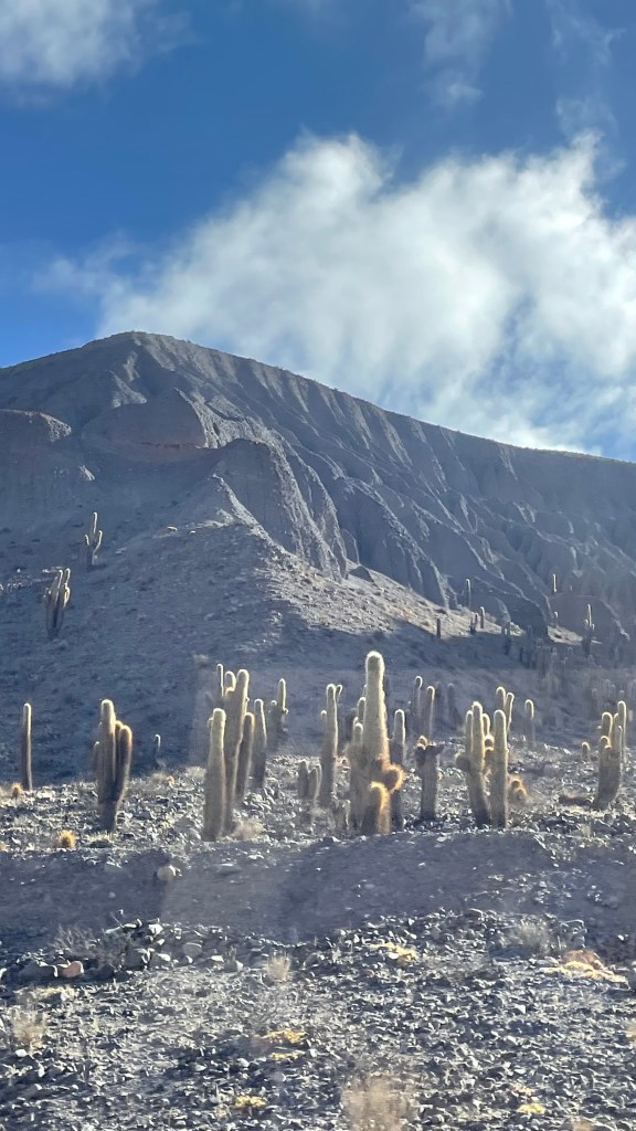 We never could imagine being evacuated at nearly 4000meters. It is no fun but this actually happened to us when we went for a trip on el tren a las Nubes-train to the clouds. After a very long bus trip by bus from the station in Salta we arrived at the San Antonio de los cobres. A very small town in northwest Argentina located at a high elevation (3,775meters or 12,385 feet above sea level. Instead of trees. the hills are dotted with large cacti and some shrubs.