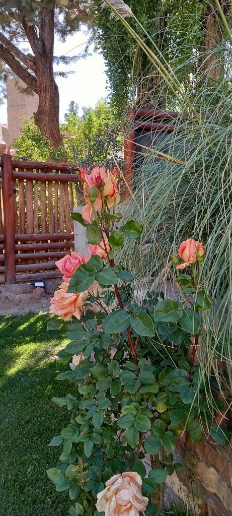 Rose blooms and Neuquén River in Chos Malal Argentina